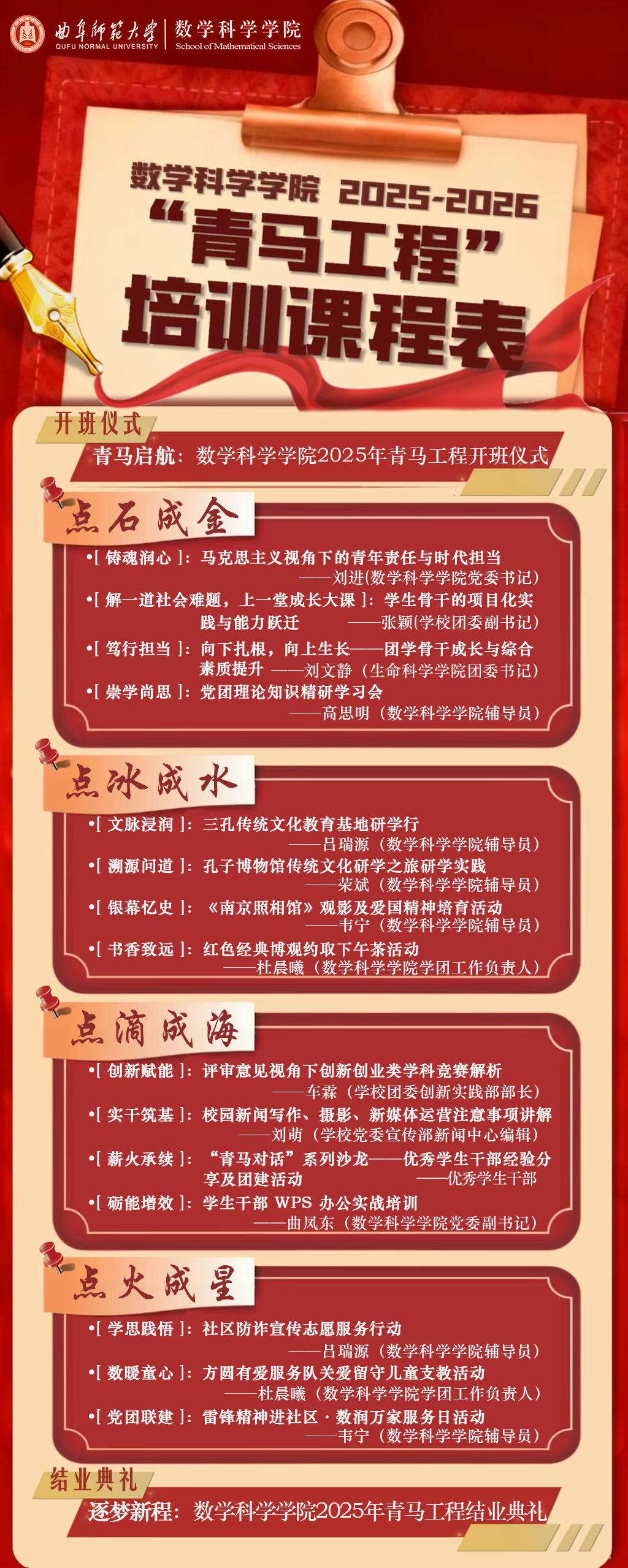 本期“青马工程”培训班将围绕理论学习、实地研学、专题讲座、素质拓展与志愿服务等多个模块展开,着力引导青年学子强化理论武装、坚定理想信念,努力成长为政治过硬、信念坚定、行动坚决的青年马克思主义者,为高水平孔子家乡大学的发展贡献青春力量。