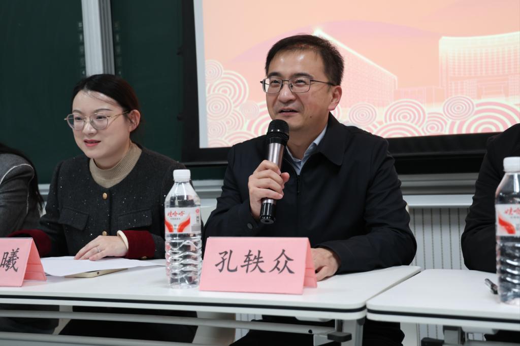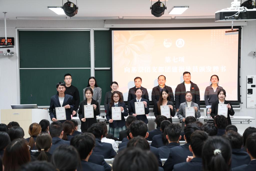 2025-2026学年基层团支部团建指导员选聘方案》,方案紧扣“党建带团建、团建促党建”主线,面向高年级全体学生党员选拔优秀人选担任 2025 级本科生团支部团建指导员,指导新生团支部开展共青团建设,激活基层团组织活力,助力学院共青团事业高质量发展。2025年度优秀学生骨干代表代表孙一诺回顾了过去一年的团学工作经历,分享了宝贵的工作经验与成长体会。2026届学生会主席姚佳毅代表全体“青马”学员发言,他表示要通过青马工程的学习,下苦功夫,练真本领,努力成为一名真正的青年马克思主义骨干。