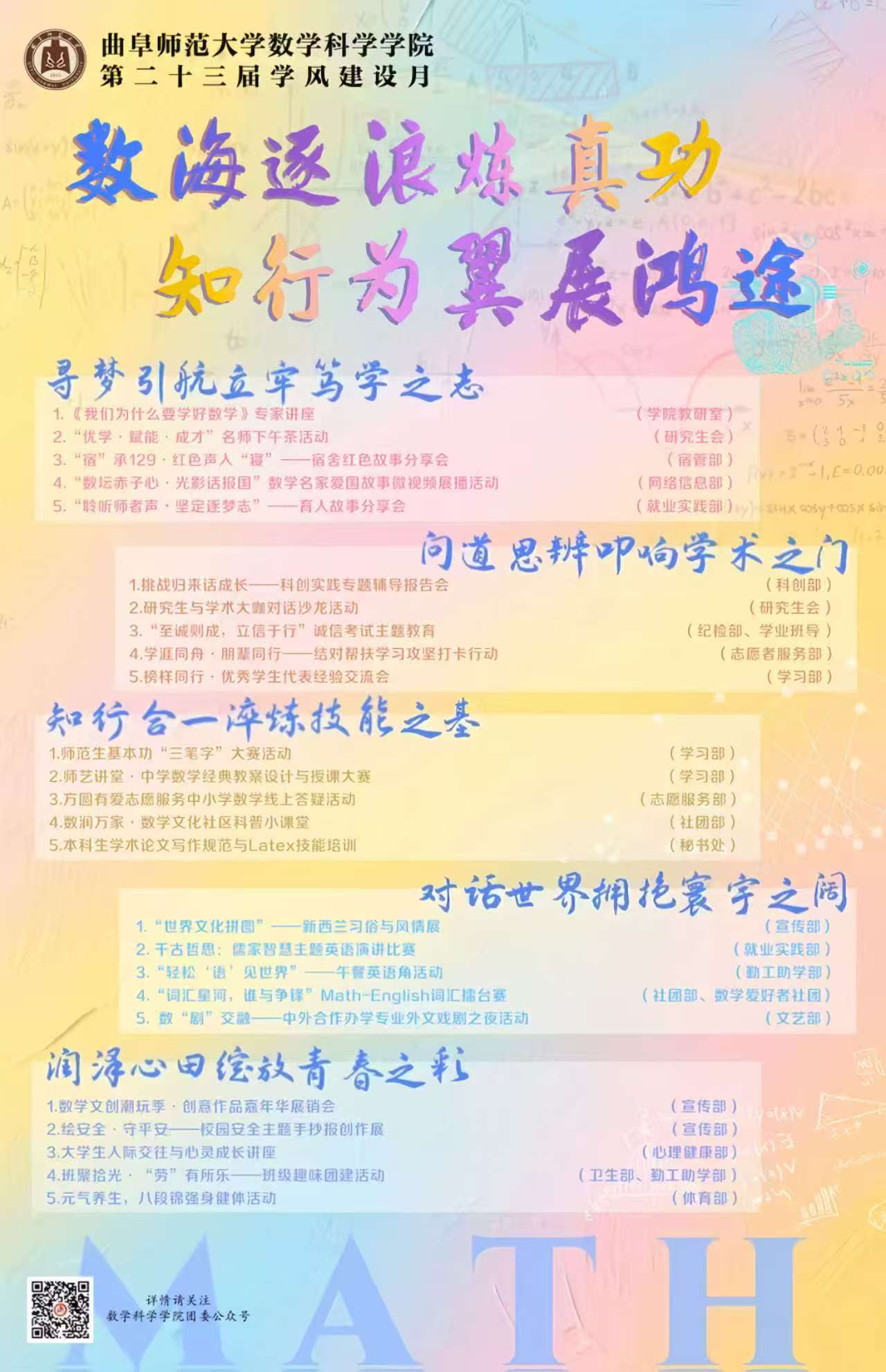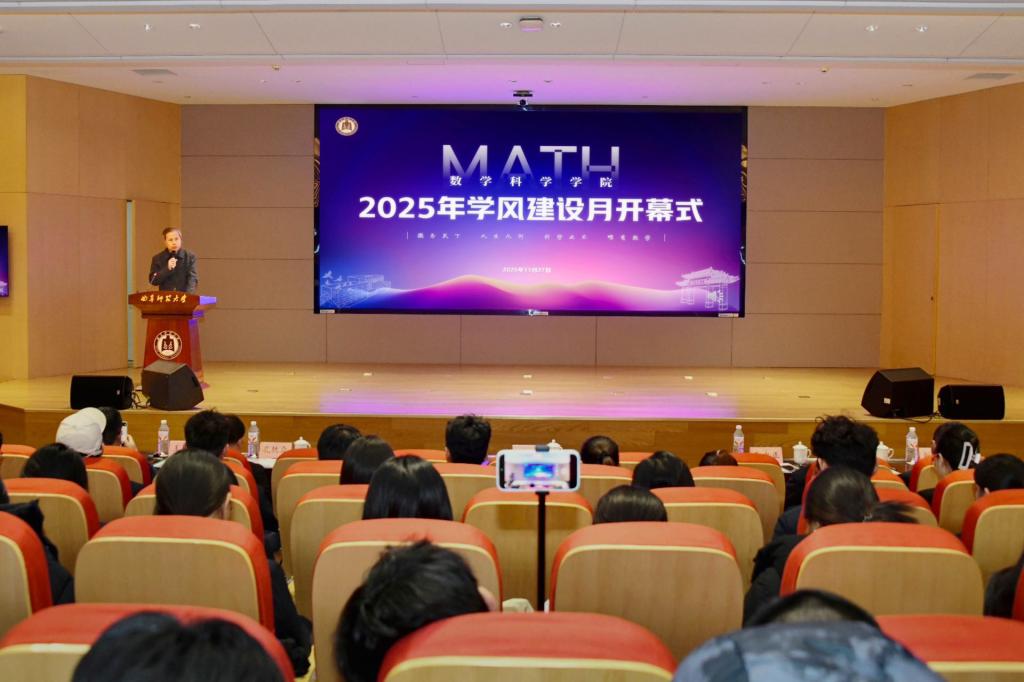 七十载学科发展成就,他指出,学风是孔孟之乡知行合一的现代延续,更是数学人治学底色的坚守。他强调,立足当前基础学科人才的迫切需求,优良学风是培养扎根教育一线、服务国家战略人才的根基。他寄语师生将严谨务实、追求卓越融入教学科研全过程,构建“全员抓、抓日常”长效机制,让优良学风成为学院最鲜明的文化名片,为学校事业发展与国家基础学科建设贡献数学力量。