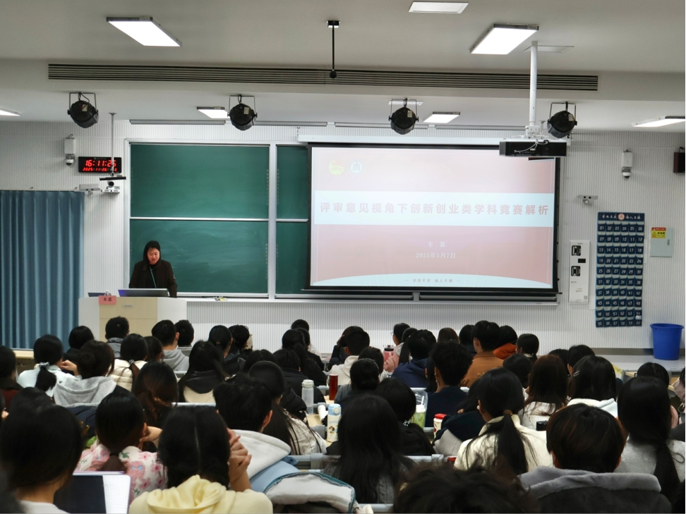 讲座现场,车霖结合多年指导学生参赛的丰富经验,为在场同学带来了一场内容翔实的指导。他首先介绍了“挑战杯”中国大学生创业计划竞赛(“小挑”)的发展历程,并聚焦备赛核心环节,详细讲解了评审规则、项目选题策略、商业计划书撰写要点及路演答辩技巧。她建议同学们,选题要紧扣“科技创新与未来产业”“乡村振兴与农业农村现代化”等五大方向,善于从国家战略中寻找灵感,并结合专业优势挖掘创新点。团队组建应注重跨专业协作,规模控制在10人以内,明确分工,建立高效沟通机制。通过剖析往届金奖项目,她向同学们强调了“创新性与实践性并重”的备赛核心理念。一份出色的商业计划书需清晰呈现“痛点-方案-成果”逻辑链,包含翔实市场分析、可行商业模式和周密风险预案。