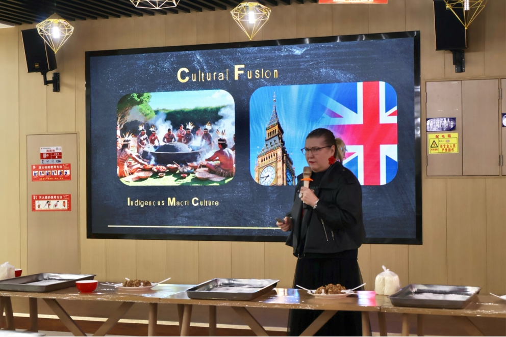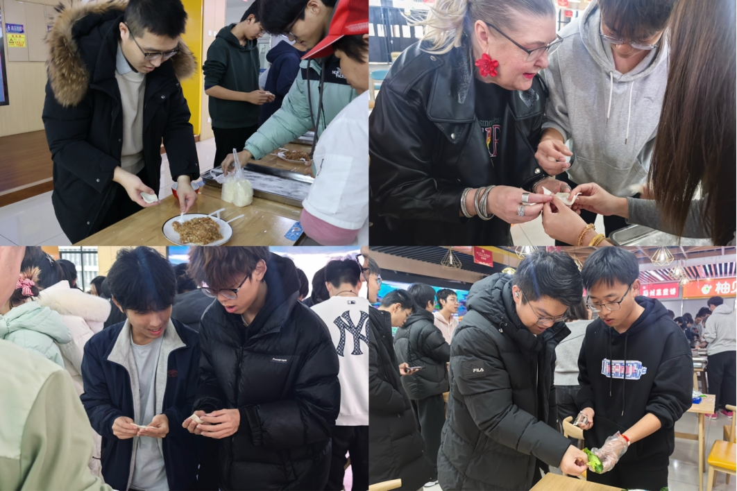 活动现场热闹非凡,大家齐聚一堂,教室里充满了欢声笑语。项目外教Lizelle老师为同学们介绍了新西兰的饮食文化,带领学生们深入了解了中国和新西兰两个国家在饮食文化上的异同。他详细介绍了毛利人人对于传统食材的独特处理方式,以及新西兰饮食文化中的丰富多样性和地域特色。随后,老师们和同学们各自分为10人左右的小组,小组成员各自肩负着不同的责任,有的负责包饺子,有的负责包馄饨,有的负责制作三明治和寿司;一个个形态各异的美食在桌上排开,有元宝形、月牙形,还有创意无限的舟形和正方形。师生们一起制作美食、聊天,大家的感情在热气腾腾的美食香气中逐渐升温。