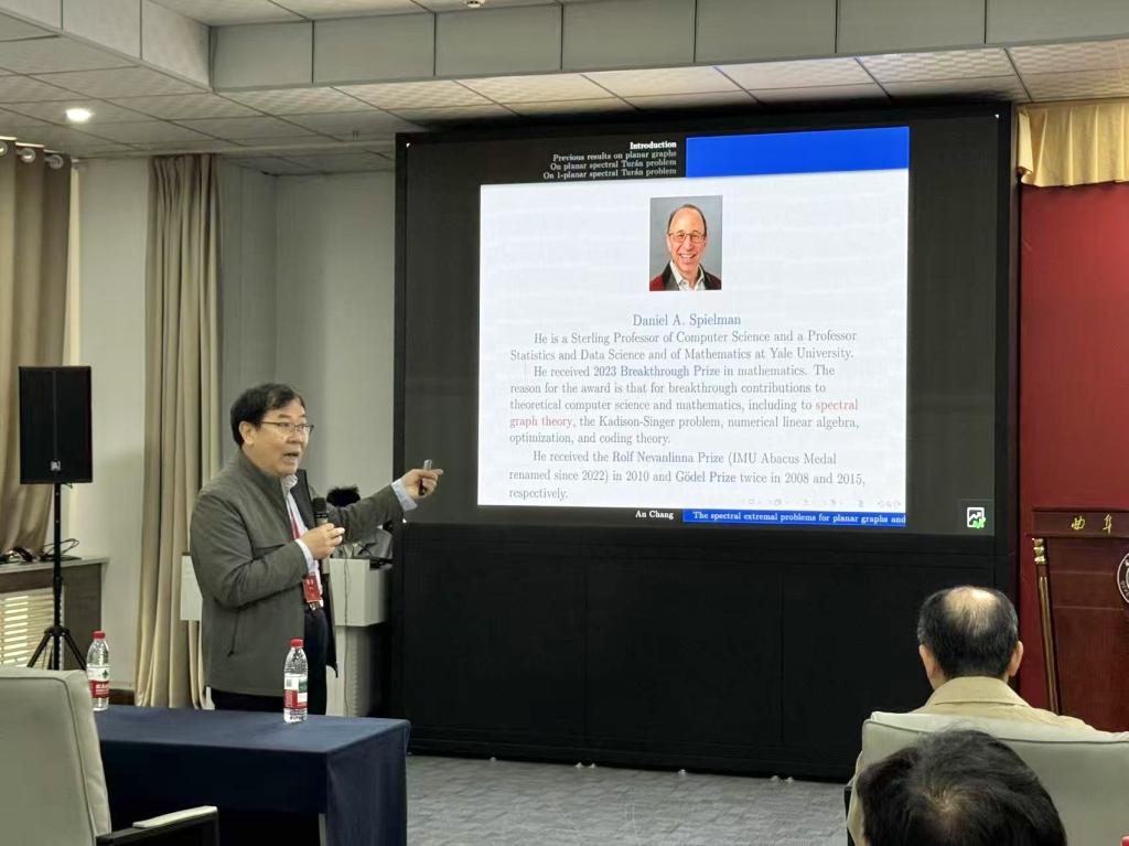 在学术研讨环节中,大会邀请了福州大学常安、国家杰出青年基金获得者浙江大学冯涛、国家杰出青年基金获得者复旦大学吴河辉、长江学者特聘专家山东大学王光辉和国家杰出青年基金获得者南开大学杨立波,围绕图谱理论、代数组合、极值图论以及时序网络等展示了该领域的最新研究成果。现场学术氛围浓厚,高水平的观点交锋与前瞻视野,为师生们带来了一场高质量的思想碰撞。